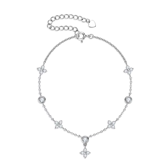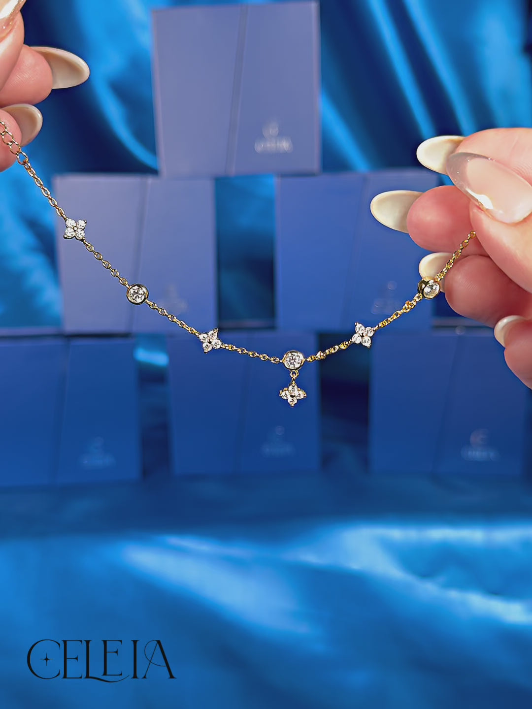 Una joya delicada y radiante que combina armonía, brillo y elegancia. Esta pulsera presenta cinco tréboles, donde cada hoja está elaborada con diamantes moissanite que capturan la luz con un resplandor excepcional. Entre cada trébol, un halo de moissanite añade continuidad y destellos sutiles. En el centro, un trébol colgante aporta movimiento y luminosidad al diseño.