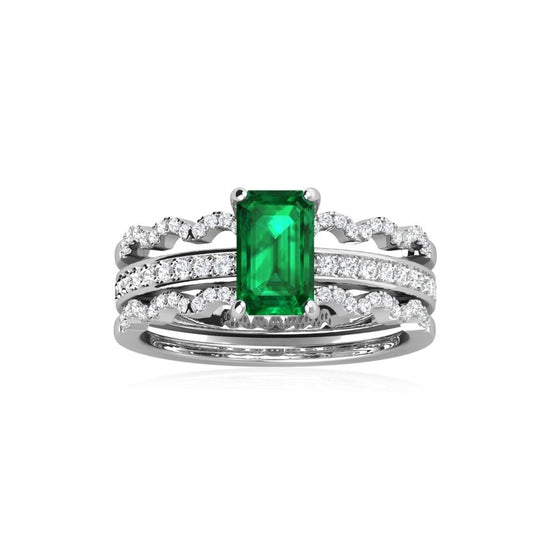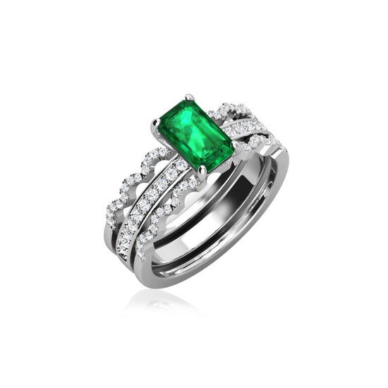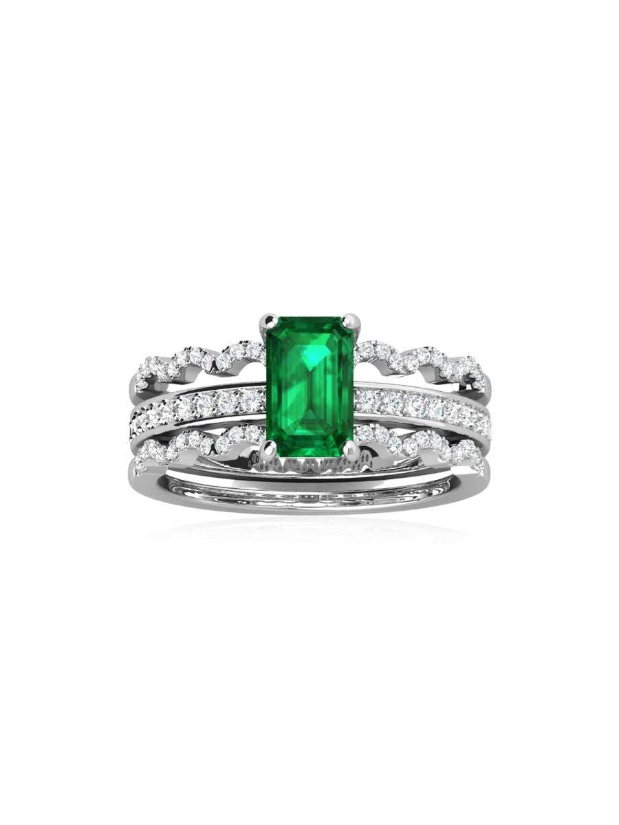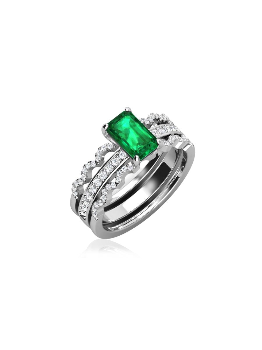 Anillo Trilogía Estelar con Esmeralda en Plata 925 y Baño de Oro Blanco de 18 kt.