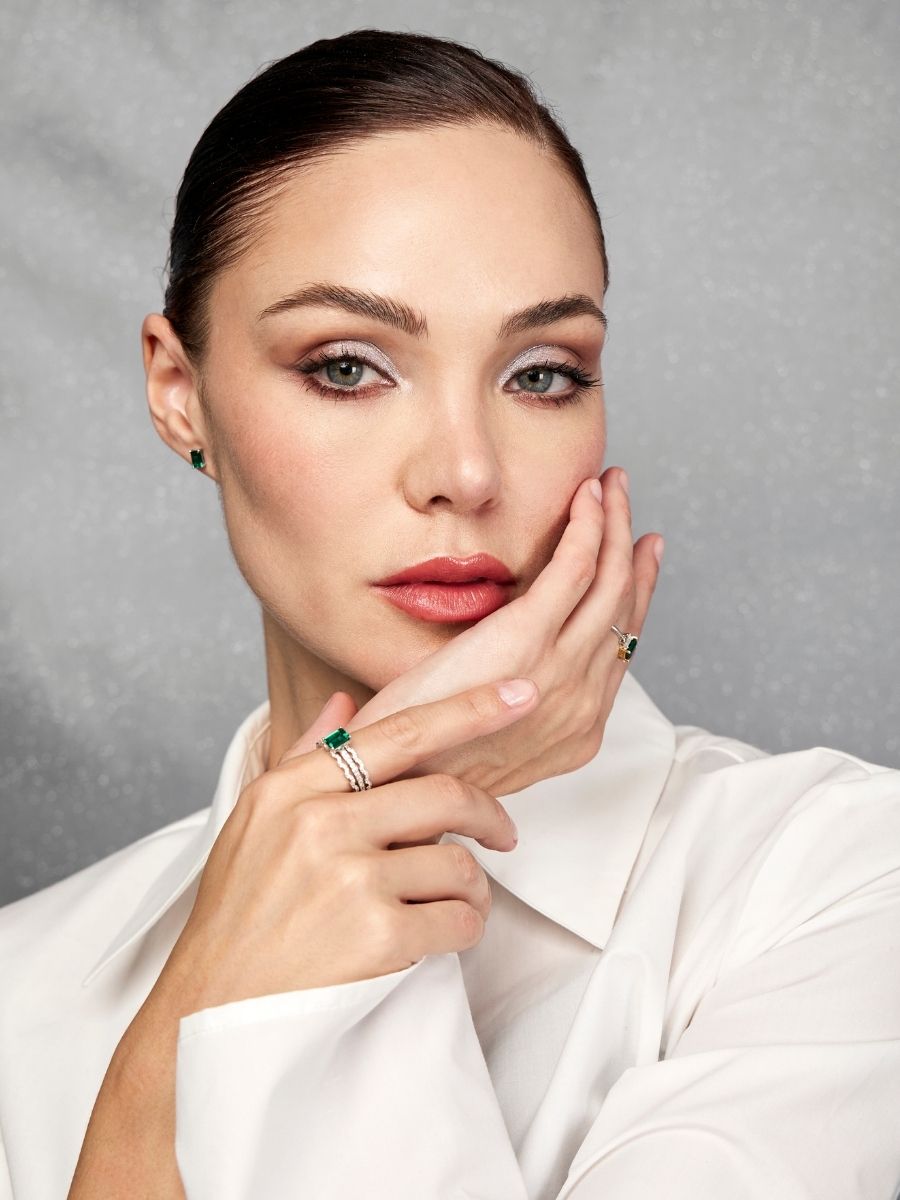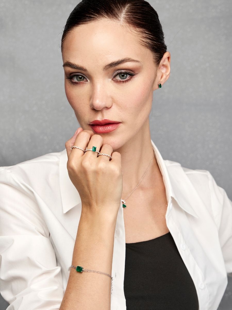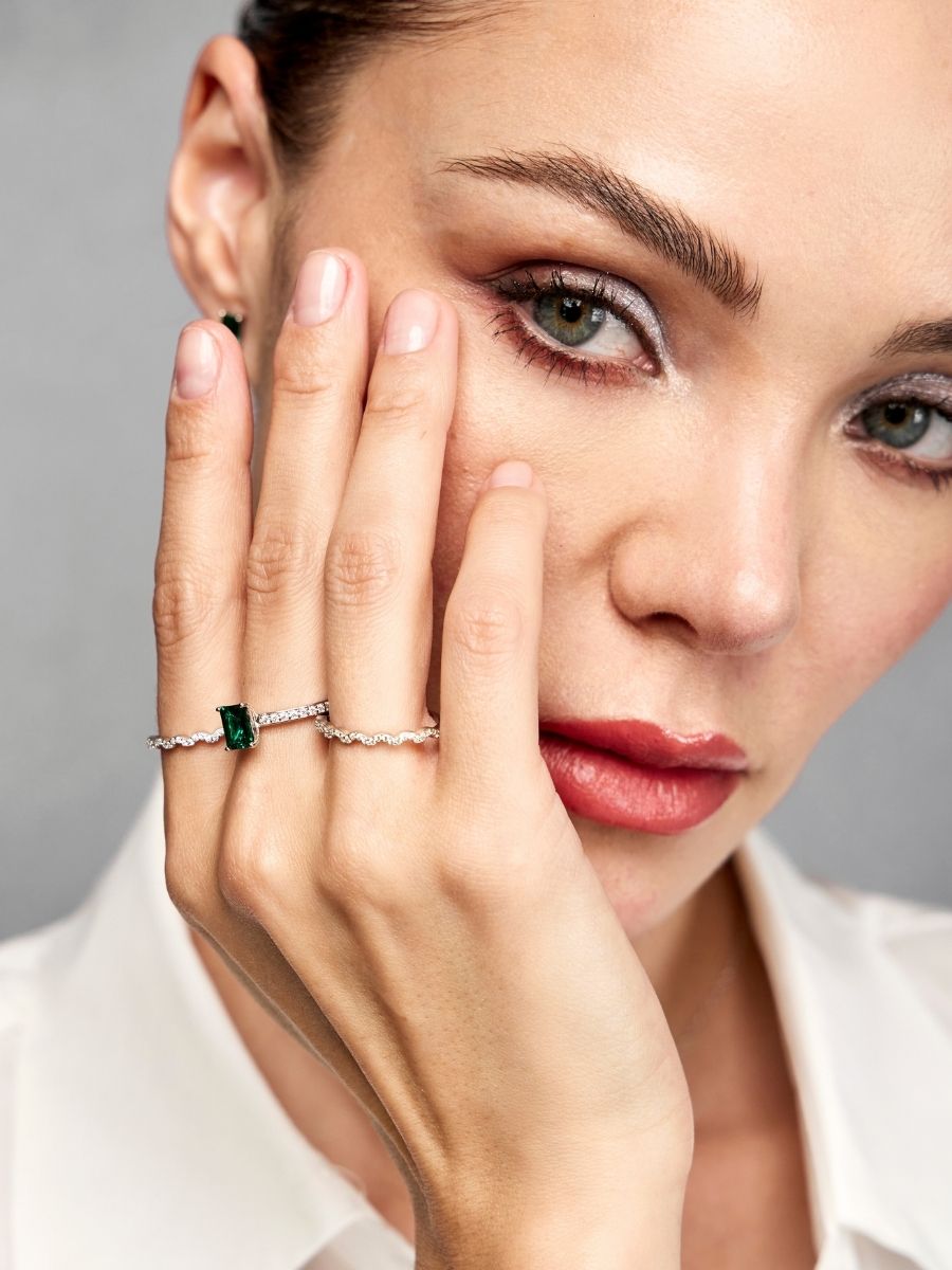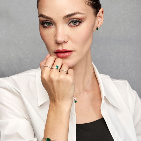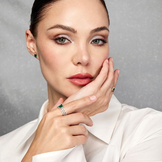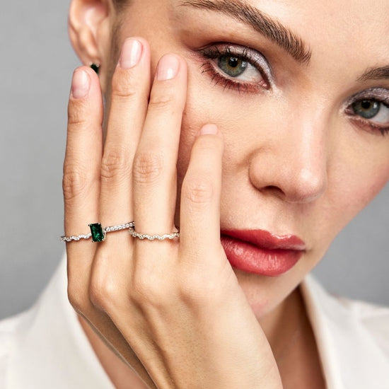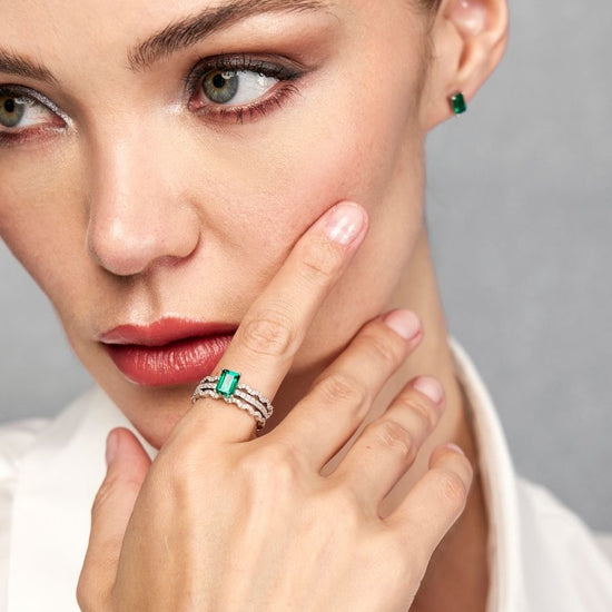 Dos anillos de ondulantes zirconias evocan el suave movimiento de la galaxia, mientras que en el centro, una majestuosa esmeralda cultivada en laboratorio en corte baguette brilla como el corazón de un astro en expansión. Pequeñas zirconias redondas como destellos de luz en la inmensidad del universo.