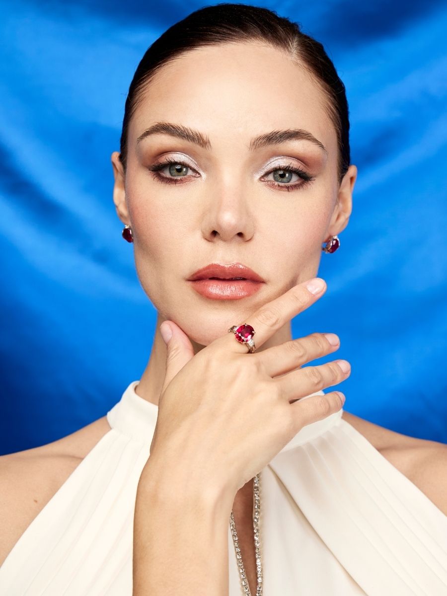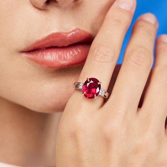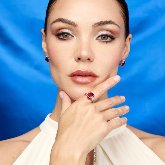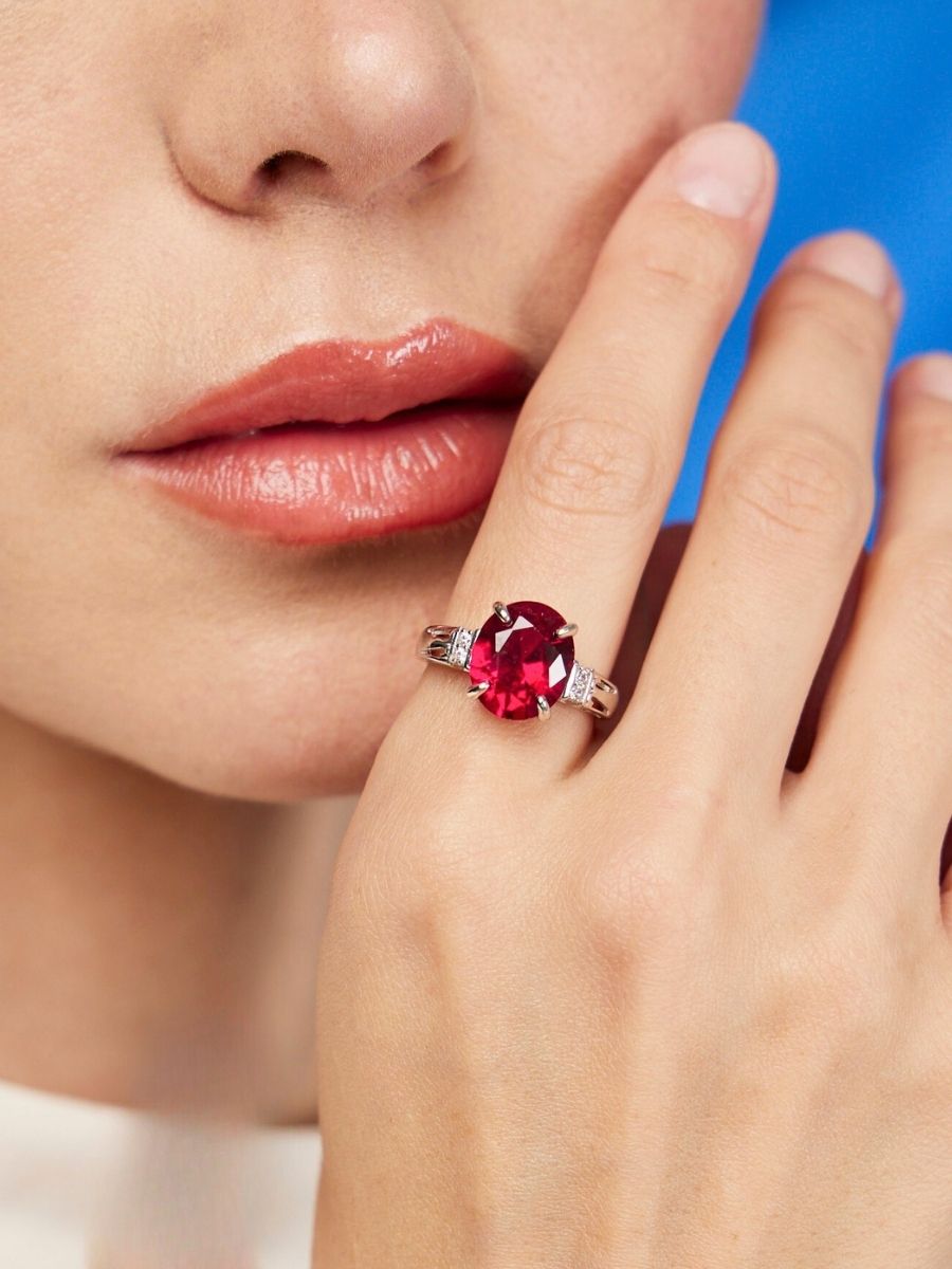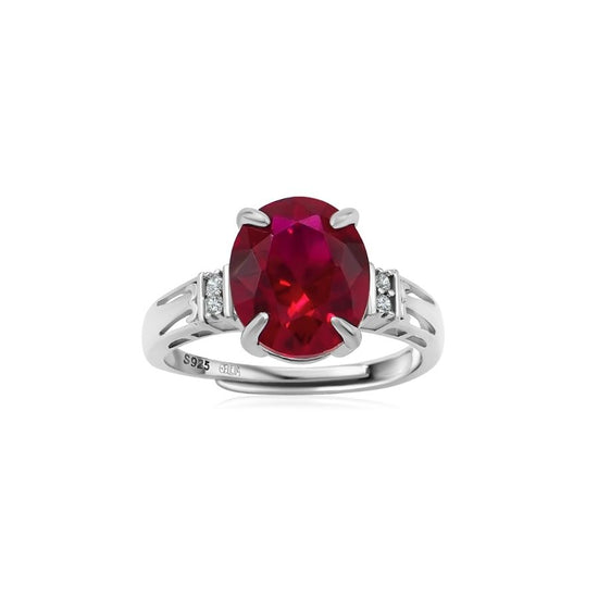 A cada lado del rubí, cuatro zirconias 5A de alta calidad añaden un toque de resplandor. Este diseño armonioso simboliza la unión entre la energía vibrante del rubí y la pureza luminosa de las zirconias, creando una joya que celebra la belleza celestial.