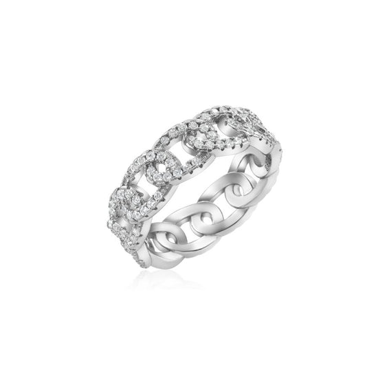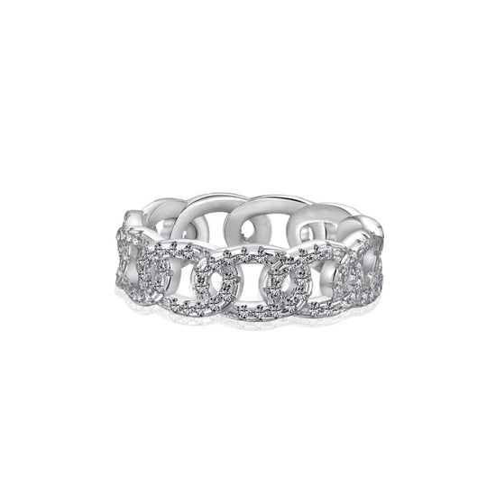 Un diseño en movimiento, inspirado en la perfección del universo. Este anillo, elaborado en plata ley 925, está compuesto por una serie de eslabones entrelazados, creando un efecto dinámico, como una órbita en constante evolución. Cada eslabón está adornado con zirconias 5A, la máxima calidad en su tipo, reflejando la luz con un brillo sofisticado. Atemporal y versátil, es una pieza perfecta para llevar sola o combinar con otros anillos.