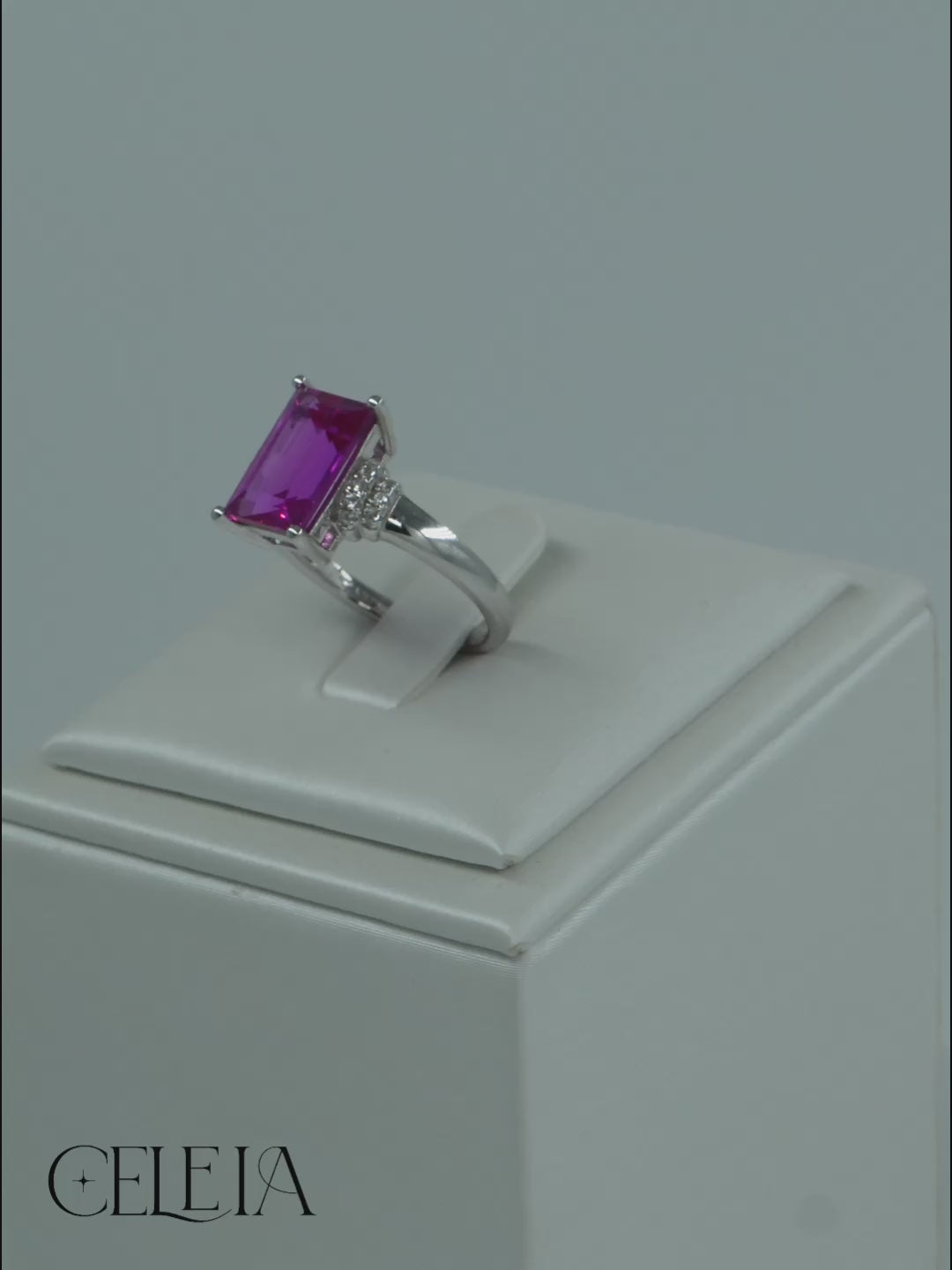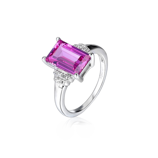 El zafiro púrpura en corte baguette, una gema poco común que aporta carácter, mientras los acentos laterales en zafiro blanco equilibran su intensidad con luz. Una joya imponente y sofisticada, creada para quienes buscan una pieza única.