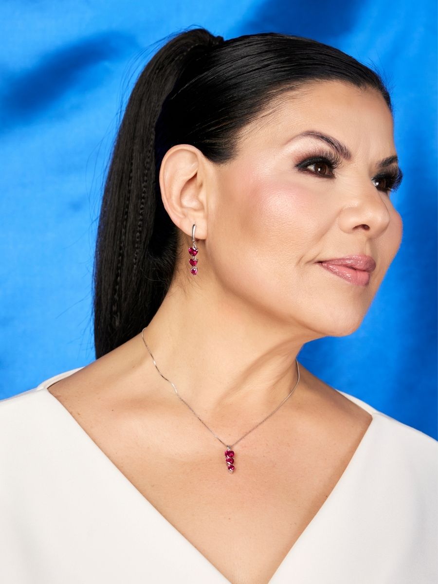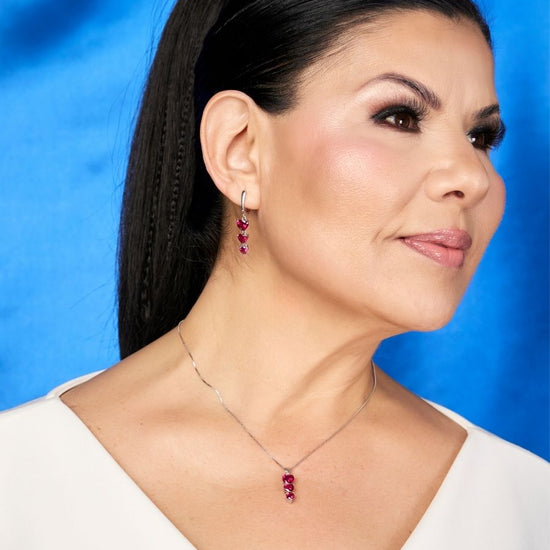 Inspirados en la pureza y pasión del amor, los Aretes Corazones con Rubí son joyas que combinan elegancia y significado. Elaborados en plata ley 925 con baño de oro blanco de 18 kt, cada arete presenta tres rubíes en forma de corazón con corte facetado, que irradia un brillo intenso y cautivador.