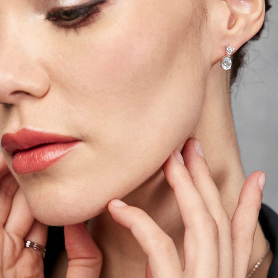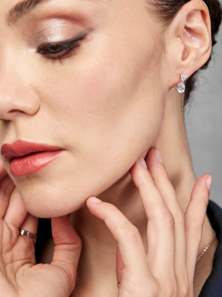 Gotas de resplandor suspendidas en el aire. Estos aretes, elaborados en Plata Ley 925 con baño de oro blanco de 18 kt, presentan dos delicados Topacios Sky Blue natural en forma de gota, acompañado por tres sutiles zirconias, evocando el brillo efímero de la lluvia iluminada Su diseño fluido captura la esencia del agua en movimiento, reflejando luz con cada destello.