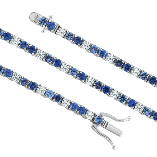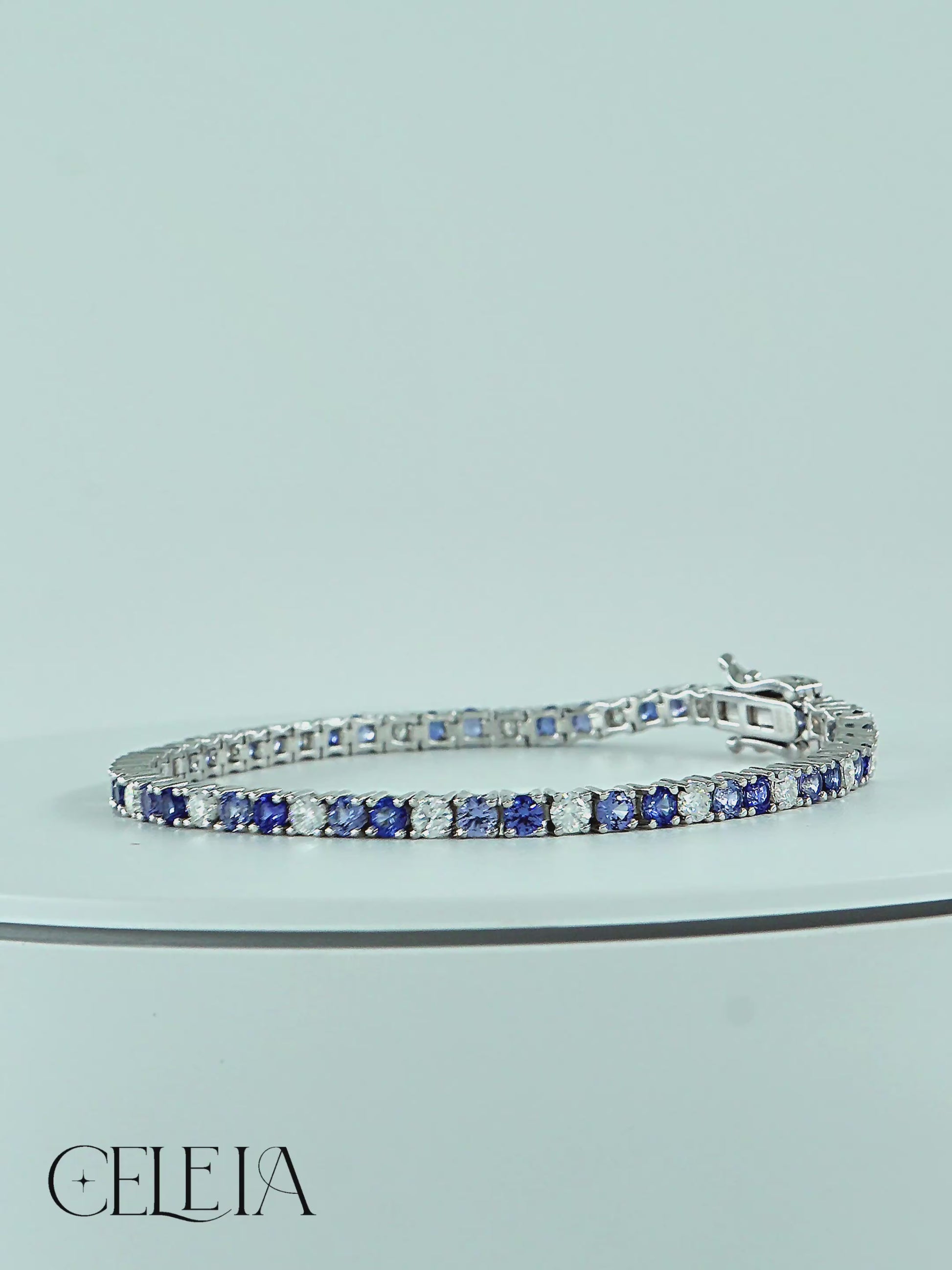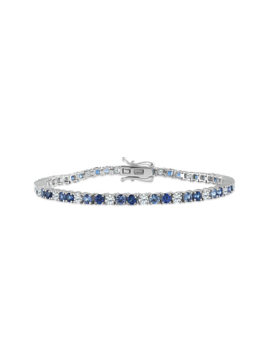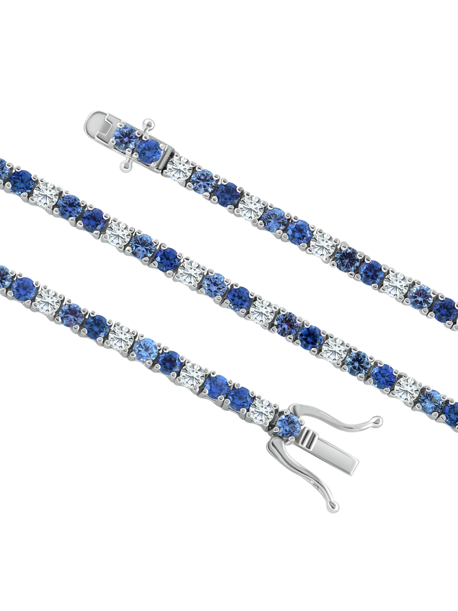 Esta pulsera tennis combina zafiros azul claro y oscuro con diamantes moissanite en una secuencia que juega con el contraste y la luz. Una mezcla inesperada de color y brillo que redefine la elegancia con un giro moderno.