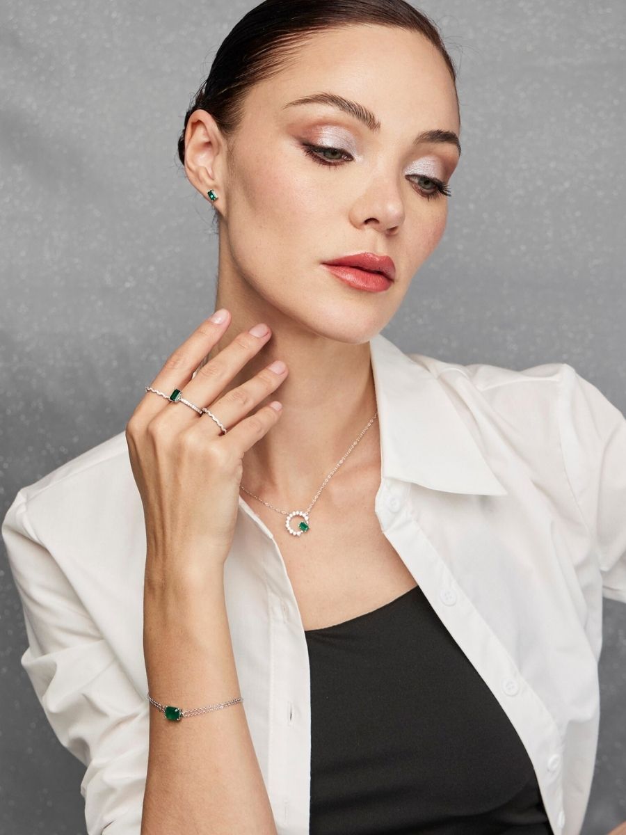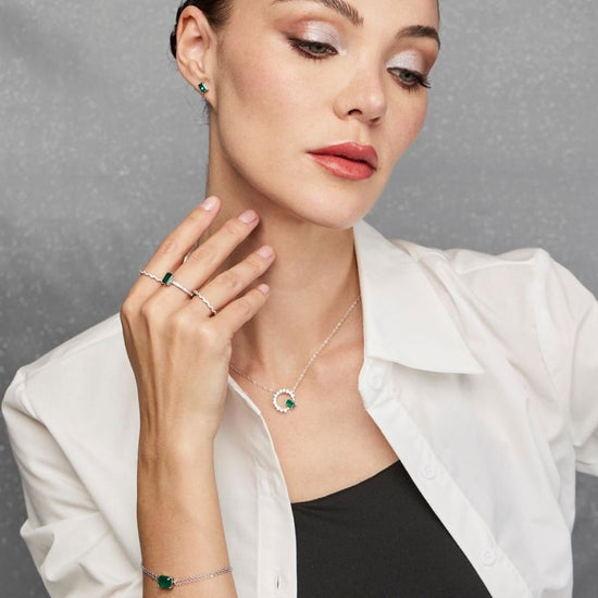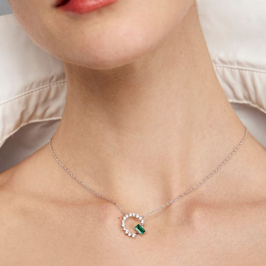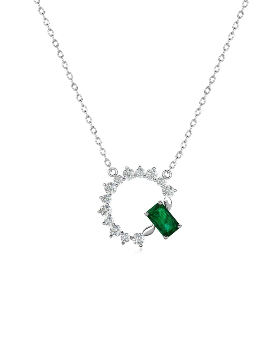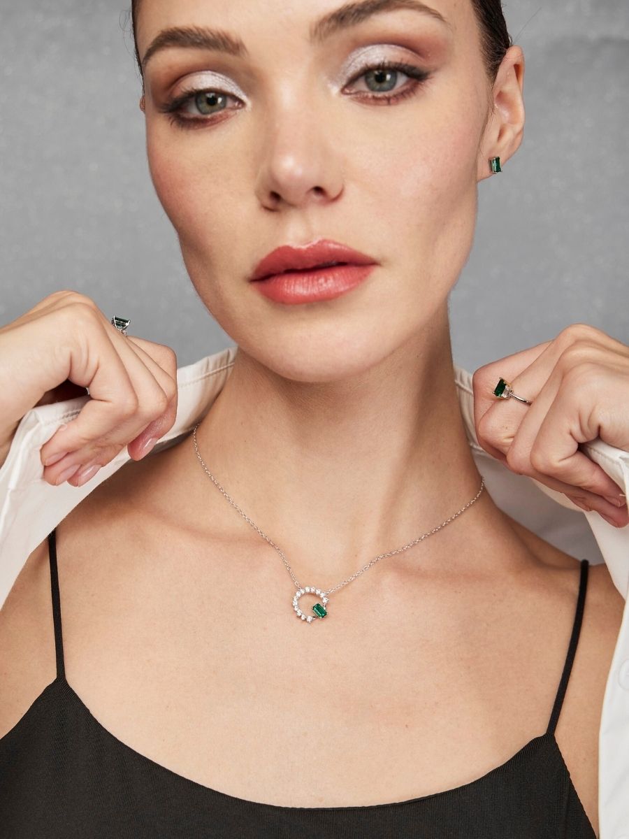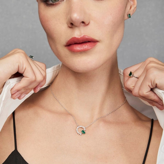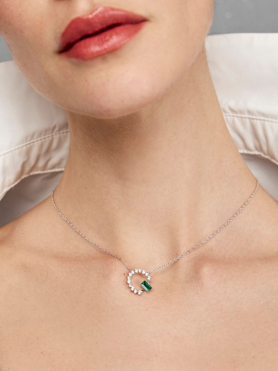 Un equilibrio perfecto entre brillo y sofisticación. Este collar, elaborado en Plata Ley 925 con baño de oro blanco de 18 kt, presenta una majestuosa Esmeralda cultivada en laboratorio en corte baguette, enmarcada por un círculo de delicadas zirconias, que crean un juego de luces inspirado en la danza de las estrellas. Su diseño atemporal es ideal para quienes buscan una pieza con carácter y luminosidad propia.