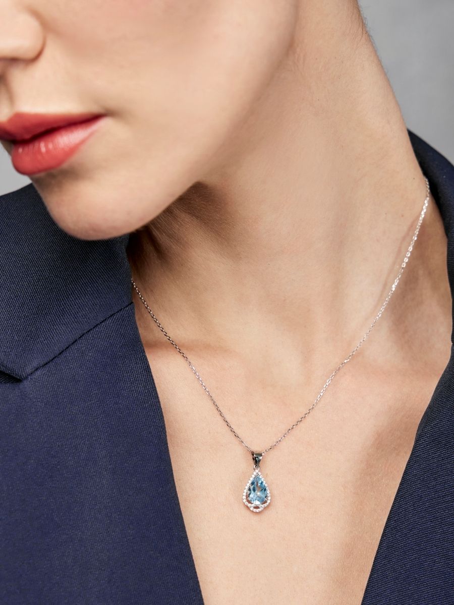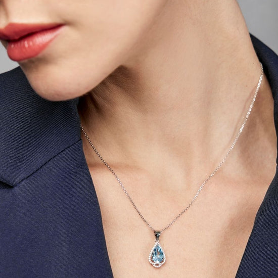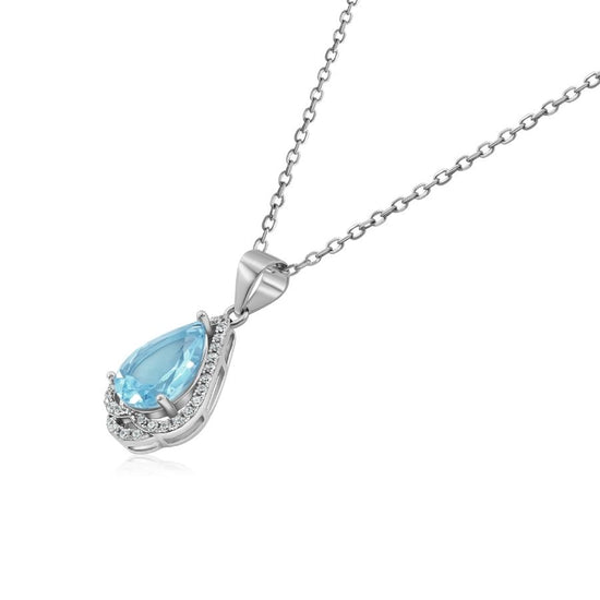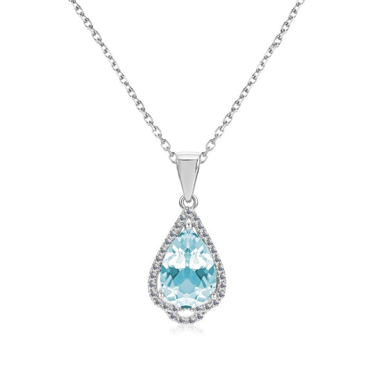 Un reflejo del cielo azul en su máxima expresión. Este collar, elaborado en Plata Ley 925 con baño de oro blanco de 18 kt, presenta un radiante Topacio Sky Blue Natural, rodeado por un halo de delicadas zirconias, evocando el brillo etéreo de la lluvia. Su diseño captura la pureza y la magia de lo celestial, haciendo de cada pieza una joya única e irrepetible.
