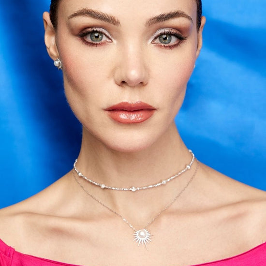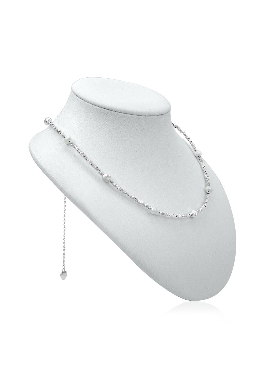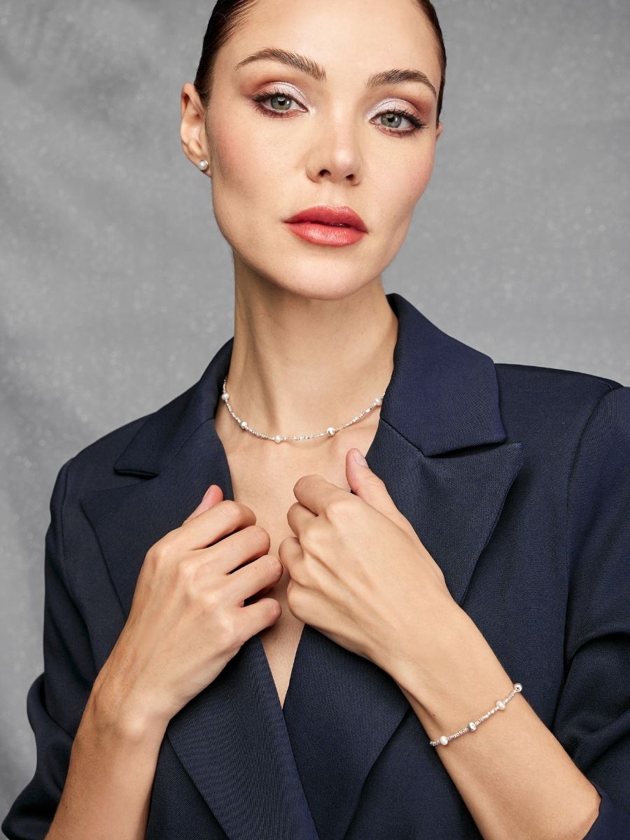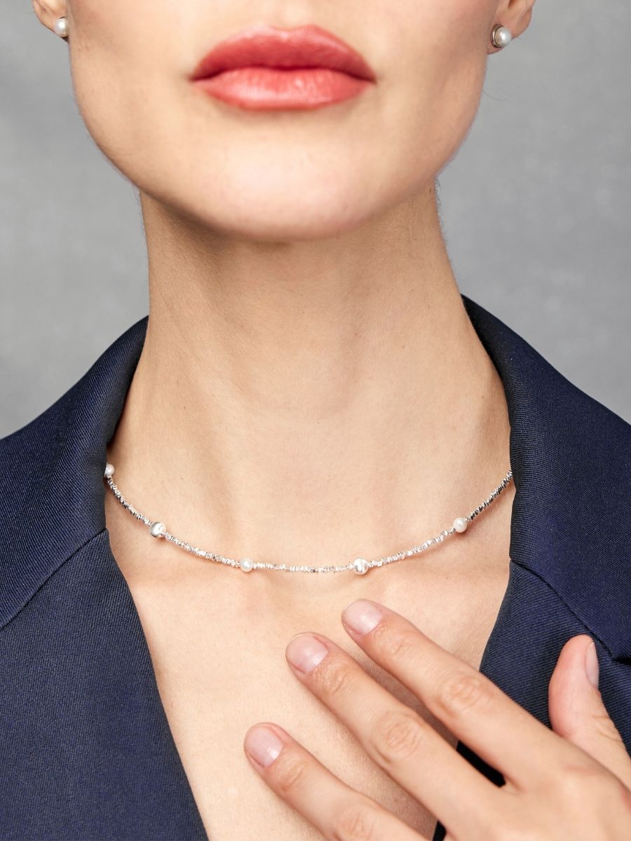 El brillo de la perla y la luz de la plata en perfecta armonía. Este collar, elaborado en plata ley 925, combina la suavidad luminosa de las perlas con el resplandor sutil de delicadas cuentas de plata, creando un contraste elegante y sofisticado. Su diseño atemporal equilibra lo clásico y lo moderno, convirtiéndolo en un imprescindible para cualquier ocasión.