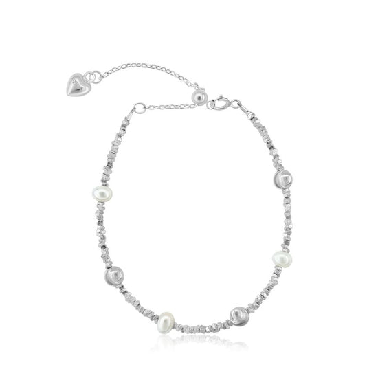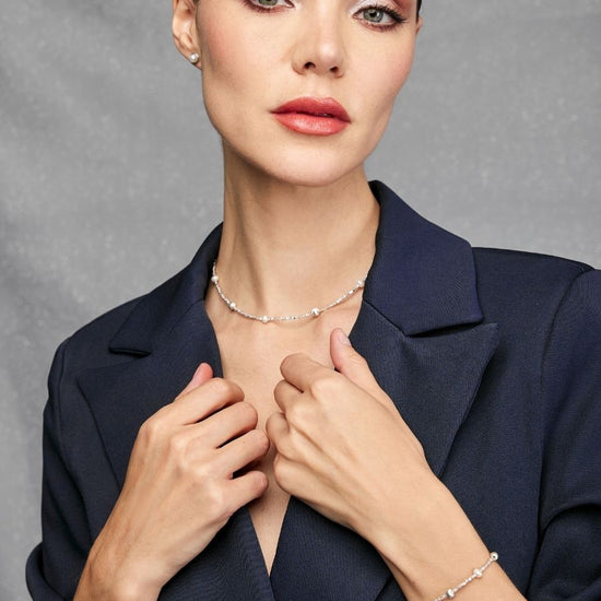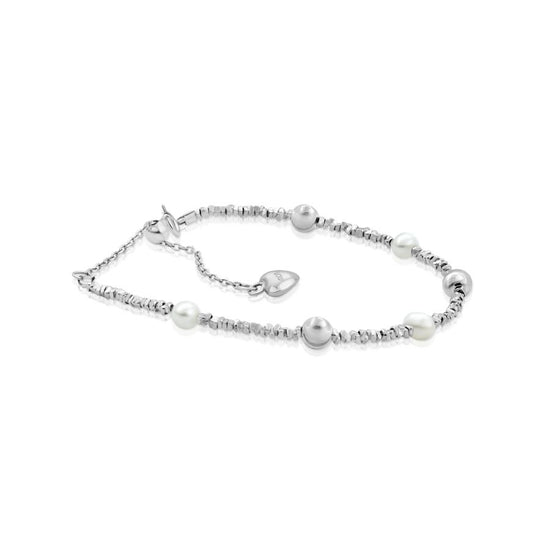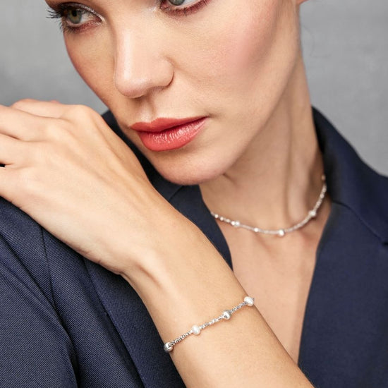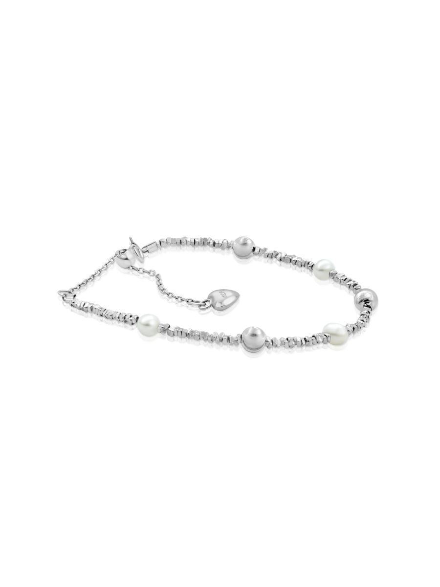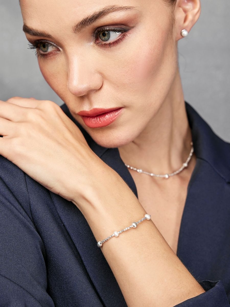 El brillo de la perla y la luz de la plata en perfecta armonía. Esta pulsera, elaborada en plata ley 925, combina la suavidad luminosa de las perlas con el resplandor sutil de delicadas cuentas de plata, creando un contraste elegante y sofisticado. Su diseño atemporal captura la esencia de la sofisticación, convirtiéndola en una joya versátil que complementa cualquier estilo con un toque de distinción.